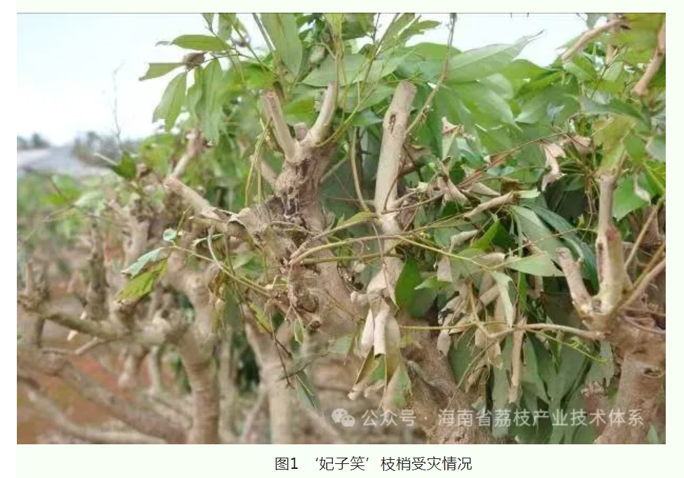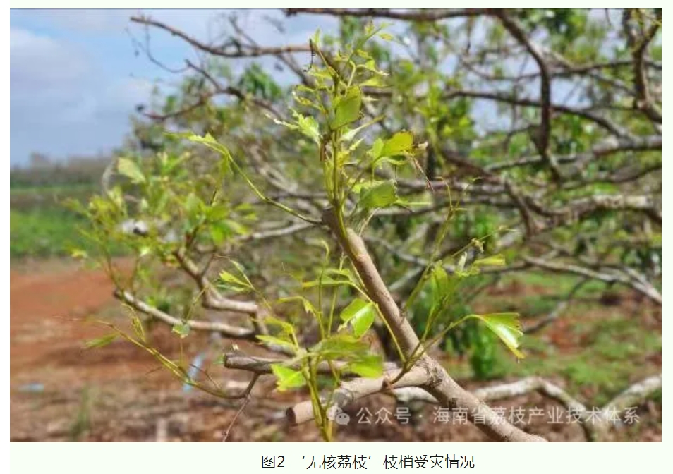荔枝枝梢生長(zhǎng)期正值海南的雨季,臺(tái)風(fēng)活動(dòng)頻繁。荔枝營(yíng)養(yǎng)生長(zhǎng)期遭遇強(qiáng)風(fēng)暴雨易造成葉片破損、樹(shù)枝折斷,甚至整株倒伏,對(duì)荔枝來(lái)年的產(chǎn)量形成造成嚴(yán)重影響,為有效應(yīng)對(duì)臺(tái)風(fēng)災(zāi)害對(duì)荔枝生產(chǎn)造成的不利影響,提出如下建議: