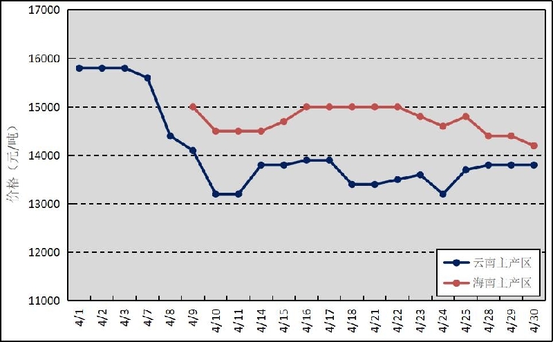 國內(nèi)主產(chǎn)區(qū):4月,國內(nèi)云南產(chǎn)區(qū)全面開割,海南產(chǎn)區(qū)和廣東產(chǎn)區(qū)月底開割。云南、海南鮮膠乳(折干膠)月均價格分別為14071元/噸、14713元/噸。