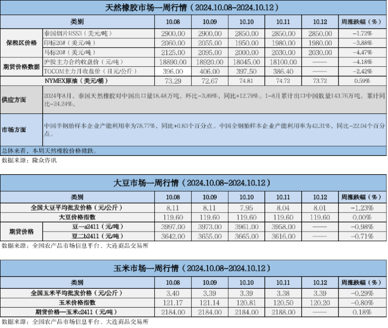 天然橡膠、大豆、玉米市場一周行情(2024.10.08-10.12)