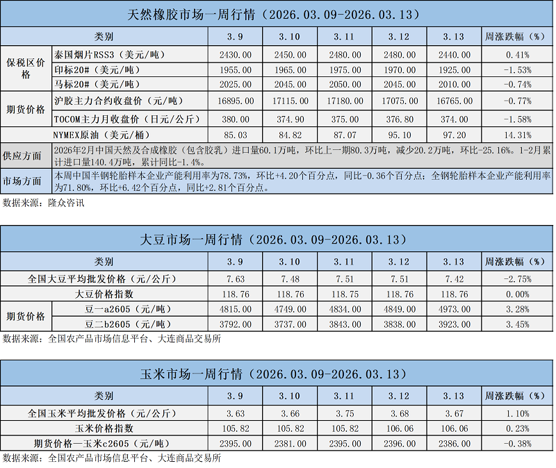 天然橡膠、大豆、玉米市場(chǎng)一周行情(2026.03.09-03.13)