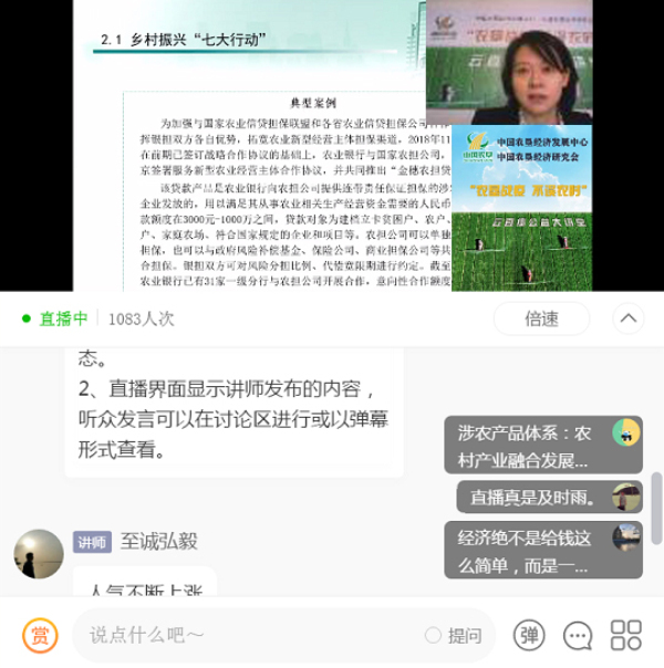 為貫徹落實中央關(guān)于統(tǒng)籌推進新冠肺炎疫情防控和經(jīng)濟社會發(fā)展工作的部署要求,4月3日上午,由中國農(nóng)墾經(jīng)濟發(fā)展中心、中國農(nóng)墾經(jīng)濟研究會主辦的“農(nóng)墾戰(zhàn)疫 不誤農(nóng)時”云直播公益大講堂首場開講。直播由中國農(nóng)墾經(jīng)濟發(fā)展中心副主任、中國農(nóng)墾經(jīng)濟研究會秘書長陳忠毅主持,邀請中國農(nóng)業(yè)銀行總行三農(nóng)對公業(yè)務(wù)部農(nóng)業(yè)金融處處長何源源講授《“三農(nóng)”金融服務(wù)助力農(nóng)墾發(fā)展》,全國各墾區(qū)、農(nóng)場及相關(guān)單位人員1400余人在線觀看,反響熱烈,效果良好。