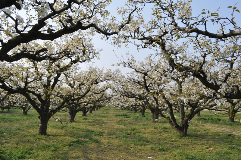 碭山,位于蘇、魯、豫、皖四省交界處,素有“世界梨都”之稱,每年陽春三月,春和景明時節(jié),碭山大地萬物復蘇,故黃漲綠,數(shù)十萬畝梨花吐蕊綻蕾,競相盛開。放眼環(huán)顧,雪堆云涌,銀波瓊浪,沃野千頃,一片花海,景象蔚為壯觀。到八月中秋,遍地金珠墜地,碭山又是果的世界,田間地頭又成了果山果海,到處人歡車鳴,芳香鋪地。置身其間,徜徉園圃,品嘗酥梨似蜜之甘甜,令人樂不思歸,流連忘返。始建于1955年的安徽農墾碭山果園場就坐落在這里。