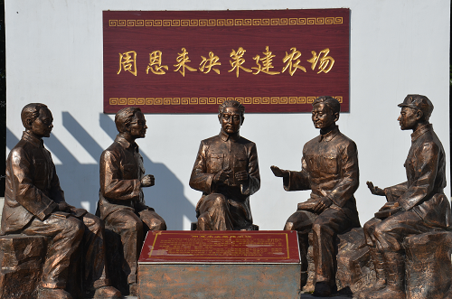 進入大院便是奮進園,周恩來總理和幾位墾荒者的巨型雕塑矗立其中。巨雕西面是群體雕塑“周恩來決策建農(nóng)場”;東面是一條綠樹掩映的半圓形文化長廊,展出著農(nóng)場各個時期的珍貴照片;南面是“福滿路”,路上錯落分布著五個巨大的蘋果門,每個門上各有一種糧食作物的圖案,寓意平平安安、五谷豐登。福滿路兩側(cè)立著24節(jié)氣石牌。