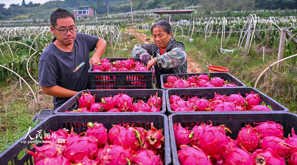 連日來,四川省眉山市仁壽縣懷仁街道吊慶社區(qū)的火龍果喜迎豐收,果農(nóng)們忙著采摘、轉(zhuǎn)運,供應(yīng)市場。