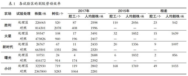 處理區(qū)內(nèi)( s/ 2 d 6 +ET 割制)人均割株比對照區(qū)(s/2d5+ET 割制)平均多 521 株,效率增幅22.84%;比處理區(qū) 2015 年(s/2d4+ET 割制時)平均多 1033 株,增幅達(dá) 58.40%,有效地提高了勞動效率。處理區(qū) 2017 年(s/2d6+ET 割制)比2015 年(s/2d4+ET 割制)減少膠工 49 人,減幅為 29.17%;處理區(qū)人均割樹位達(dá) 6 個,比對照區(qū)人均割樹位多 1 個,較大幅度地減少了膠工人數(shù)。在試驗過程中,2015 年各農(nóng)場推廣s/2d4+ET割制,到 2016年各農(nóng)普遍場推廣了 s/2d5+ET 割制,說明農(nóng)場人均割株在逐年增加,也在不斷擴崗,對緩解膠工短缺問題具有積極的作用。