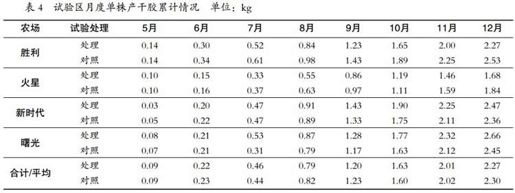 5—12 月處理區(qū)與對照的單株干膠產(chǎn)量累計都相差不大;6 月、7 月單株干膠產(chǎn)量累計分別比上月增加幅度均較小,8 月、9 月、10 月和11 月單株干膠產(chǎn)量累計分別比上月增加幅度均較大,12 月單株干膠產(chǎn)量累計比上月增加幅度較?。ū?#8197;4)。
