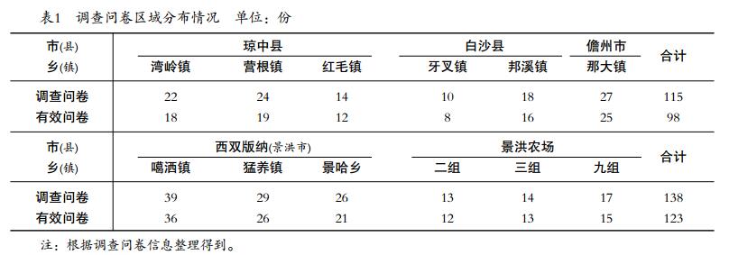 為避免膠農(nóng)對(duì)調(diào)查問卷中問題專業(yè)說法不理解,提高問卷質(zhì)量,本文調(diào)查形式主要采用“一對(duì)一”問答形式,由被調(diào)查者回答問題,調(diào)查者填寫問卷,對(duì)每個(gè)問題詳細(xì)詢問,能夠真正了解膠農(nóng)天然橡膠生產(chǎn)情況。問卷的調(diào)查方式主要是天然橡膠種植區(qū)域聚集地挨戶走訪、收膠點(diǎn)隨機(jī)抽樣調(diào)查、膠園地頭隨機(jī)抽樣調(diào)查。共填寫調(diào)查問卷253份,其中有效調(diào)查問卷為221份,問卷有效率為87.4%。調(diào)查問卷區(qū)域分布情況見表1。