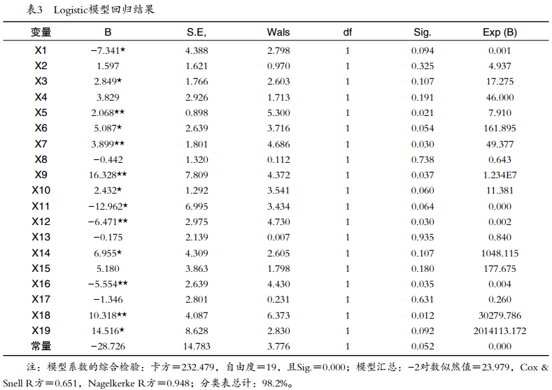 利用微觀調(diào)研數(shù)據(jù),從農(nóng)戶自身特征、家庭特征、割膠制度認(rèn)知特征、天然橡膠市場(chǎng)、基層組織環(huán)境角度的分析結(jié)果,對(duì)膠農(nóng)選擇割膠制度存在一定影響,本節(jié)從計(jì)量數(shù)學(xué)方法上分析民營膠農(nóng)選擇割膠制度的影響因素。二元Logistic模型是線性回歸逐漸發(fā)展的產(chǎn)物,當(dāng)被解釋變量、解釋變量中存在0/1二值品質(zhì)型變量時(shí),一般線性回歸模型不能夠滿足回歸分析,繼而選擇二元Logistic回歸模型。本文以我國民營膠農(nóng)割膠制度選擇情況為因變量,影響膠農(nóng)割膠制度選擇的變量為自變量,二元Logistic模型適合本文研究。